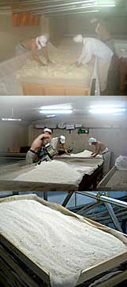 現在、たいてい酒蔵には麹室(こうじむろ)と呼ばれる特別の部屋があり、そこで麹造りが行われています。床暖房やエアコンなどで温度は30℃近く、湿度は60%以下に保たれています。温度が高いのは、そうしないと黄麹菌が培養されないからで、また湿度に関しては、それ以上高いと黄麹菌以外のカビや雑菌が繁殖してしまうからです。入室には全身の消毒が必要で、関係者以外は入れません。それに加え、室外から雑菌が入り込まないように二重扉、密閉窓、断熱壁など、かなり念入りに造られています。よく「麹室は酒蔵の財産」と言われるのはここからきています。約二日〜三日の間、高温多湿が保たれている製麹室で麹菌の繁殖により蒸米は刻々と変化していきます。その間、寝ずの番で監視・点検・調節が行われ、できあがったものが 麹となります。それは米粒のまわりに霜がついたように見え、かすかに栗の匂いがします。