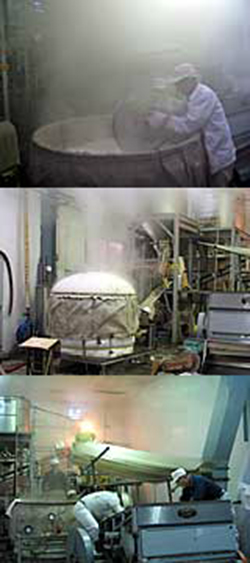 その後、麹の酵素が米のデンプンを分解しやすくさせるために、米を蒸す。この工程を正式には蒸きょう(じょうきょう:「きょう」は「食へんに強」)、もしくは杜氏蔵人言葉で蒸しといいます。甑(こしき)という大きな蒸籠(せいろ)に移して、約1時間ほど乾燥蒸気で蒸す。蒸しあがった米は、「外硬内軟」といって、外側がパサパサとしていて内側が柔らかいのがよいとされています。外側が溶けていると、コウジカビの定着の前に腐敗が始まる恐れがあり、また、内側に芯が残っていると、米で一番良質のデンプン質を含んだ部分が、糖化・発酵しない可能性があるからです。一般的に蒸しあがった米は、こうじ菌をまぶして麹にするものと、直接発酵タンクに送られるもの、とに分けられます。