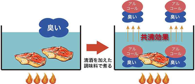 日本酒に含まれるアルコールは、揮発するとき、素材に含まれる臭い成分を一緒に連れ去ることによって消臭効果を発揮します。この臭い成分を連れ去る効果を「共沸(きょうふつ)効果」といいます。