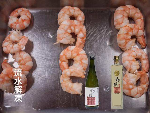 冷凍エビをボウルに入れ、酒を入れて解凍するだけ。生臭くならないのと、補水効果でエビはプリプリに仕上がります。またどんなお肉でも日本酒に漬け込むことによりその臭みを防ぎ、身を柔らかくする効果と共に味を素材の中にぎゅっと押し込めてくれます。