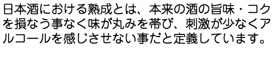 「酒の育ちの上で一番大切なのは何と言っても熟成であるといっても過言ではありません。日本酒は同じ醸造酒であるワインに比べ、「熟成」に重きが置かれにくい酒です。日本酒には特有の天敵である「火落ち菌」が発生しやすく、酸性の強いワインより変質のスピードがはるかに速いのです。しかし、この大切な熟成を現在の日本酒は、比較的軽く見られています。一定期間の貯蔵熟成が絶対に必要な事は、新酒の荒い風味と強いアルコール香が嫌われることでも分かると思います。適度に熟成した良い酒は、味に「まるみ」があり、全体が「調和」し、アルコール香がなく、「舌ざわりが滑らか」で喉越しが良く、味の切れが良いなど造り手でなければわからないような特徴を持つものです。
